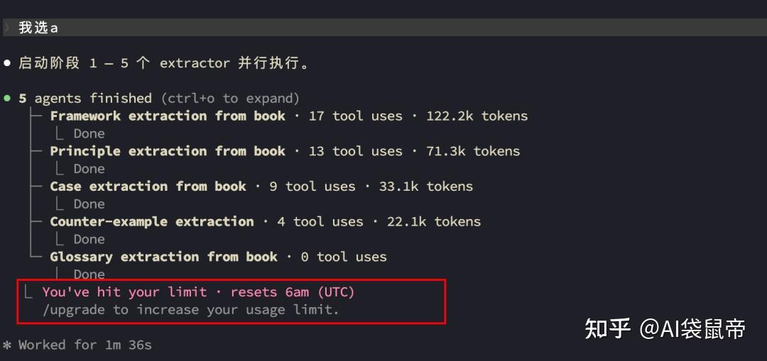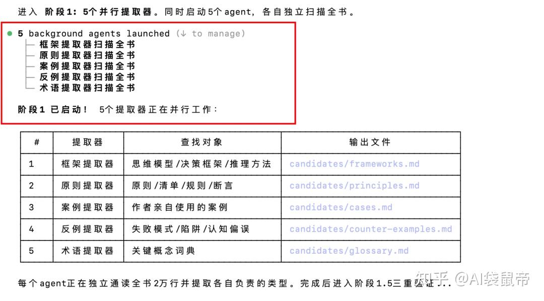五个Agent先行扫描全文。然后一个思维框架,一个找原则,一个找作者案例,一个找反面教训,一个术语词典。各自独立工作,互不干扰。