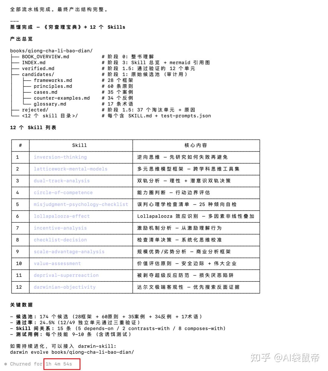 这套流程跑完,一本书会被蒸馏成一套Agent Skills,包含几个甚至几十个原子化的Skill(取决于书的知识密度)。每个Skill都能独立被调用,都有明确的适用场景和边界。
